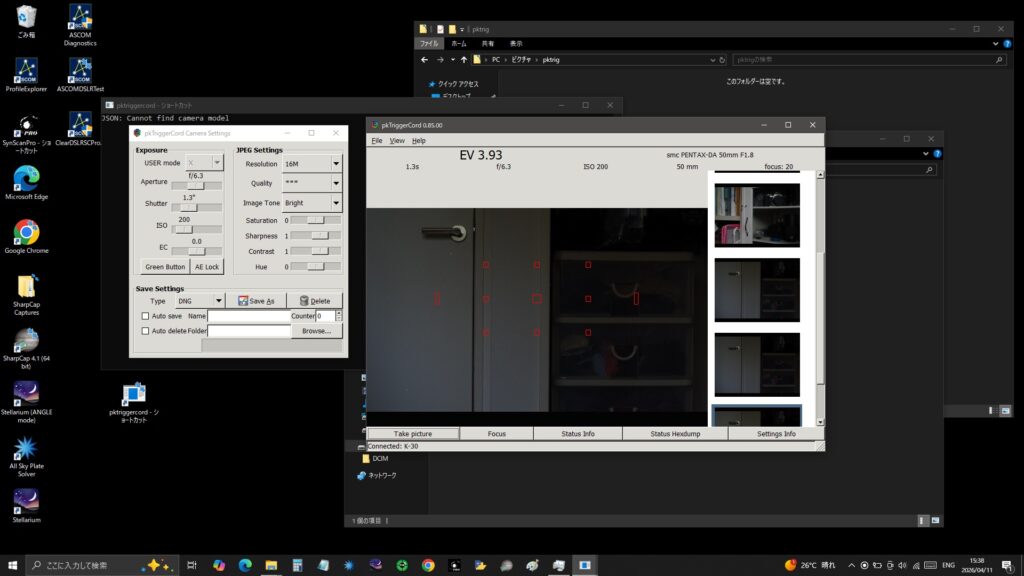 古いペンタックスのカメラでは唯一のテザーソフトではないかと思います。以前ASCOMの一眼レフコントロールソフトを使いましたがダメでした。